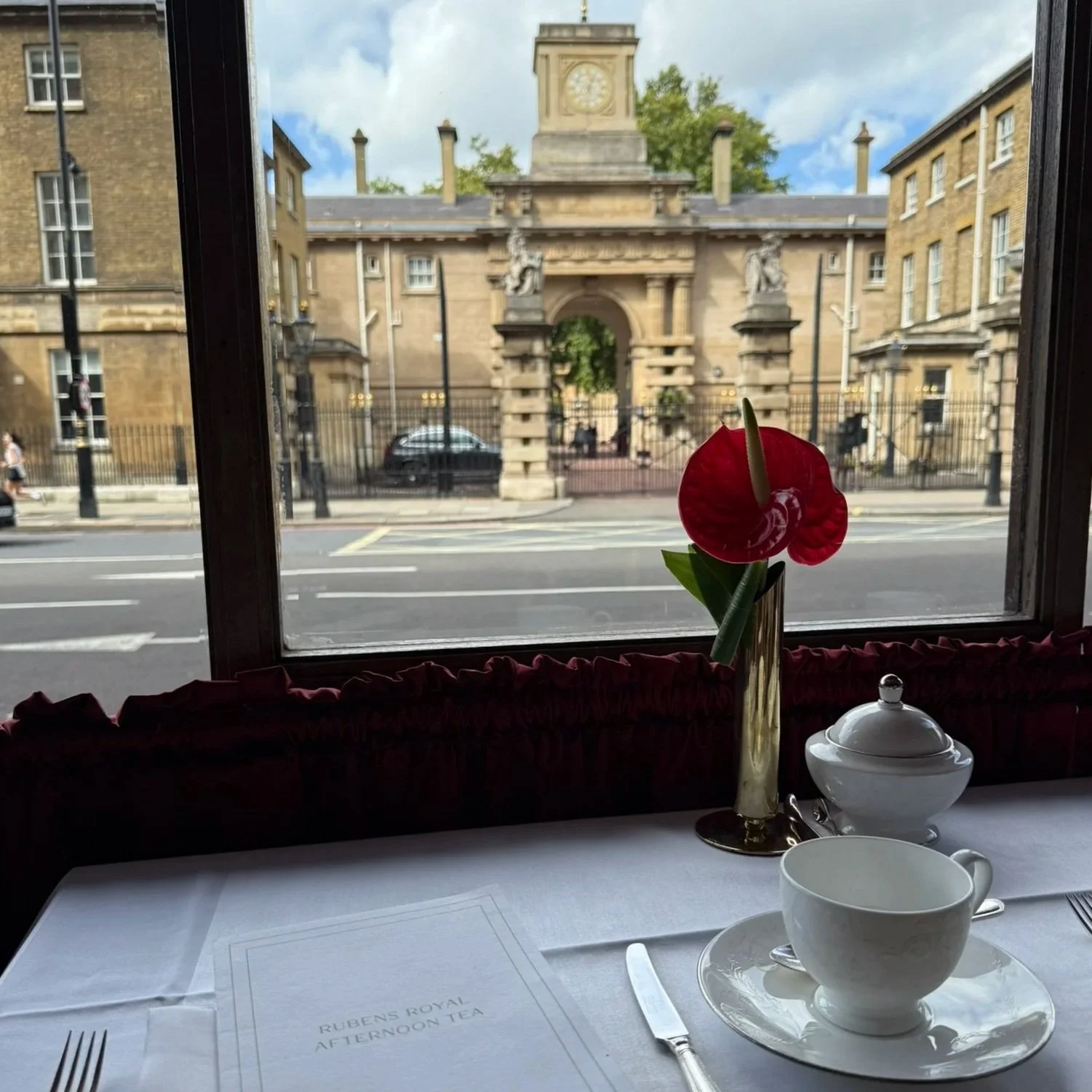 Then we trained to The Rubens at The Palace for high tea. We were early so we walked by Buckingham Palace to get a close-up view. It wasn’t nearly as crowded as the day of the changing of the guards. For high tea, we were seated right by the window in a love seat which was so fun for people watching, with a view of the Royal Mews.
